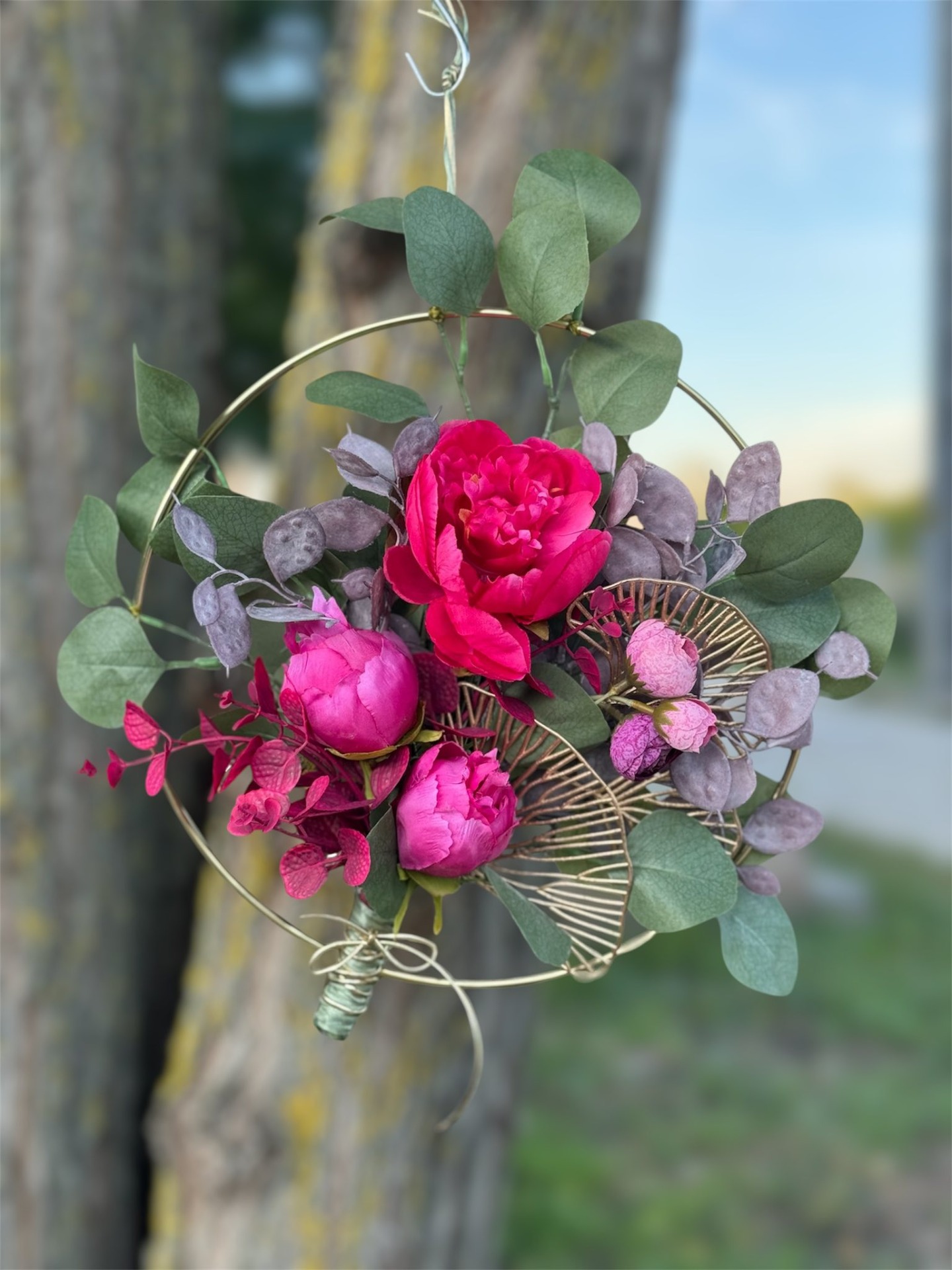 A modern arany karika finomságát a pink virágok élettelisége és a zöld levelek frissessége teszi teljessé. Egy kis játékosság, egy kis luxus – ami minden környezetet feldob.