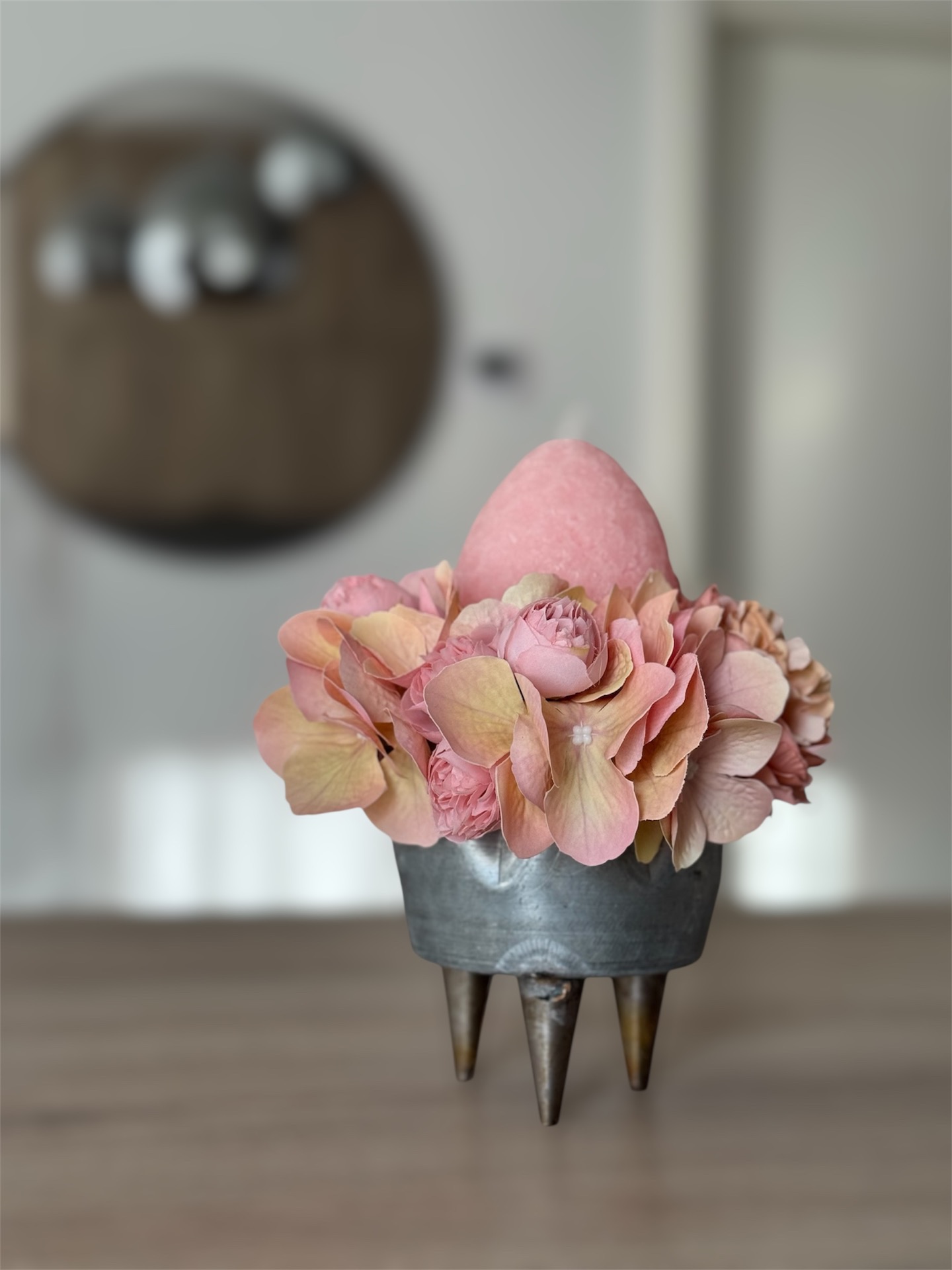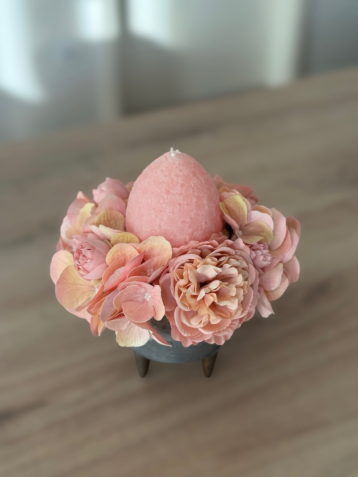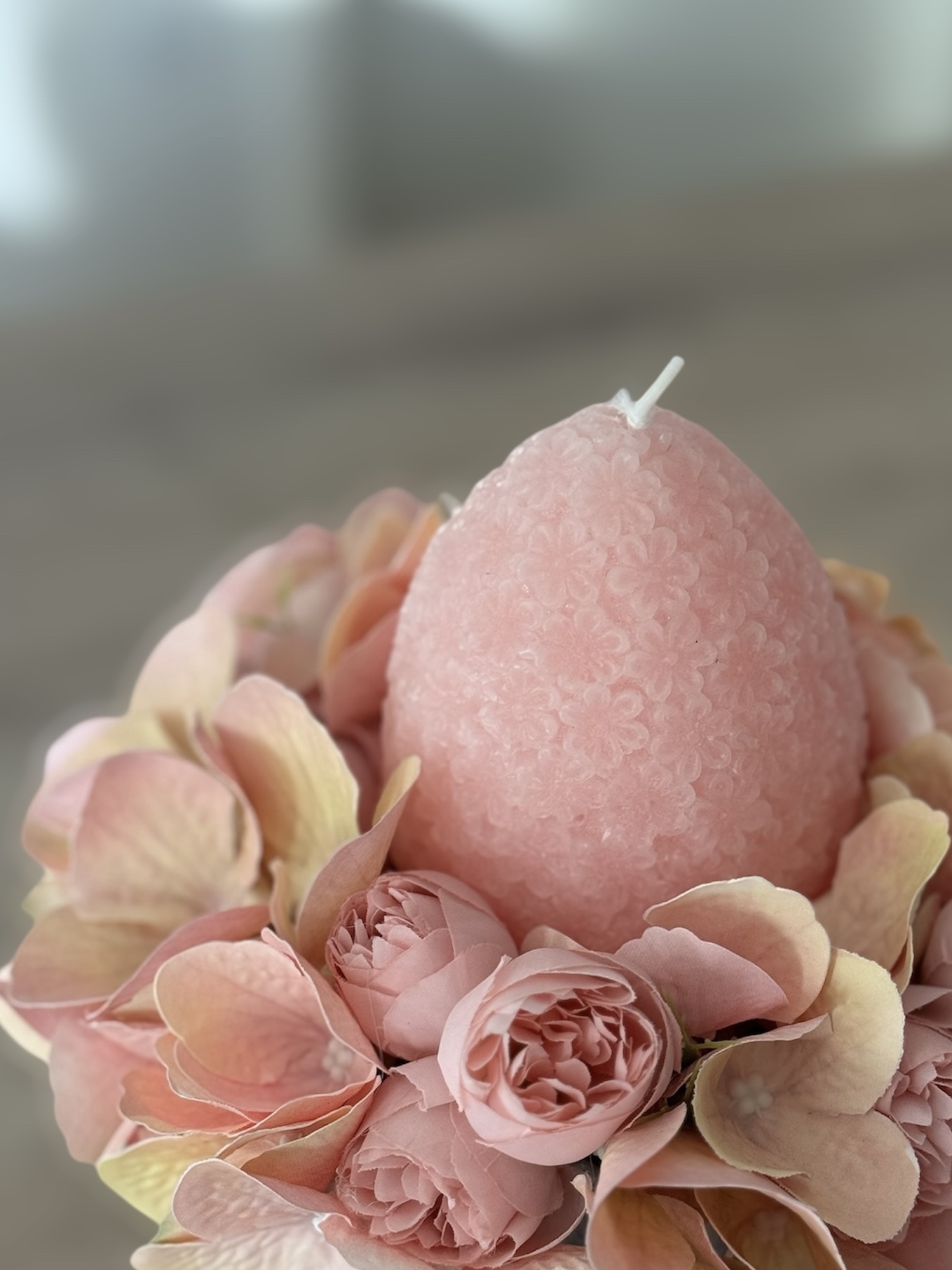 Ez a különleges kompozíció nem csak dísz: gyertya + selyemvirág egyben. Romantikus, púderes színek. Tökéletes ajándék vagy húsvéti dekor.