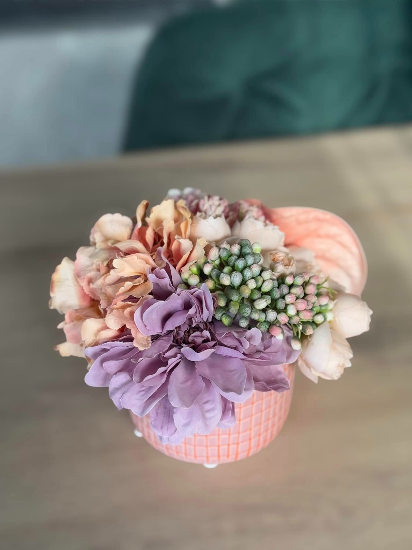 Pasztell asztaldísz flamingóvirággal. Kerámia kaspóban.