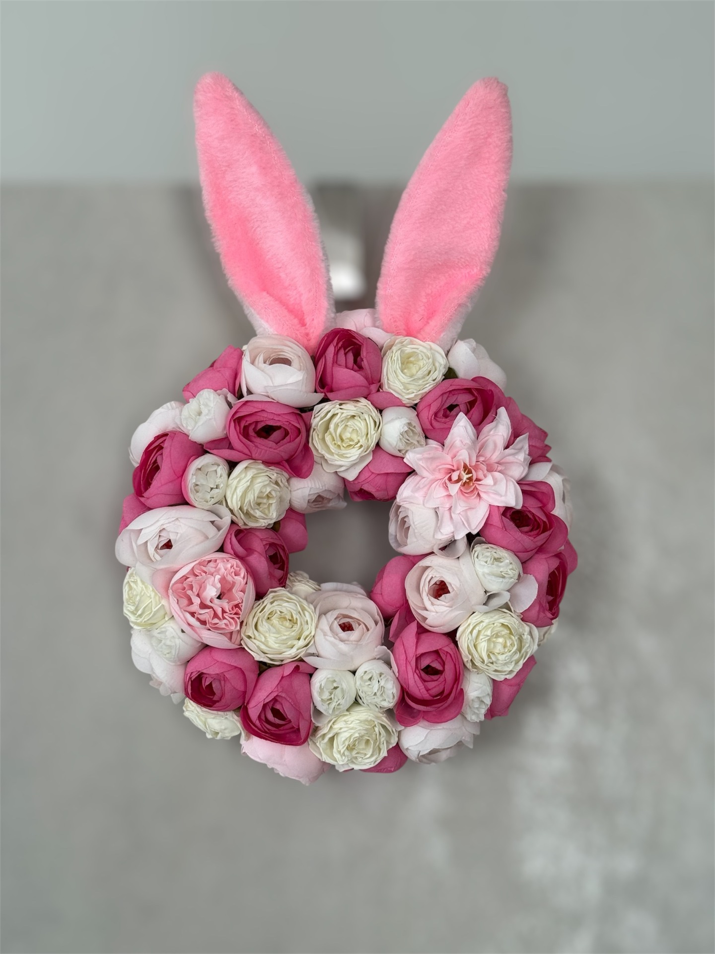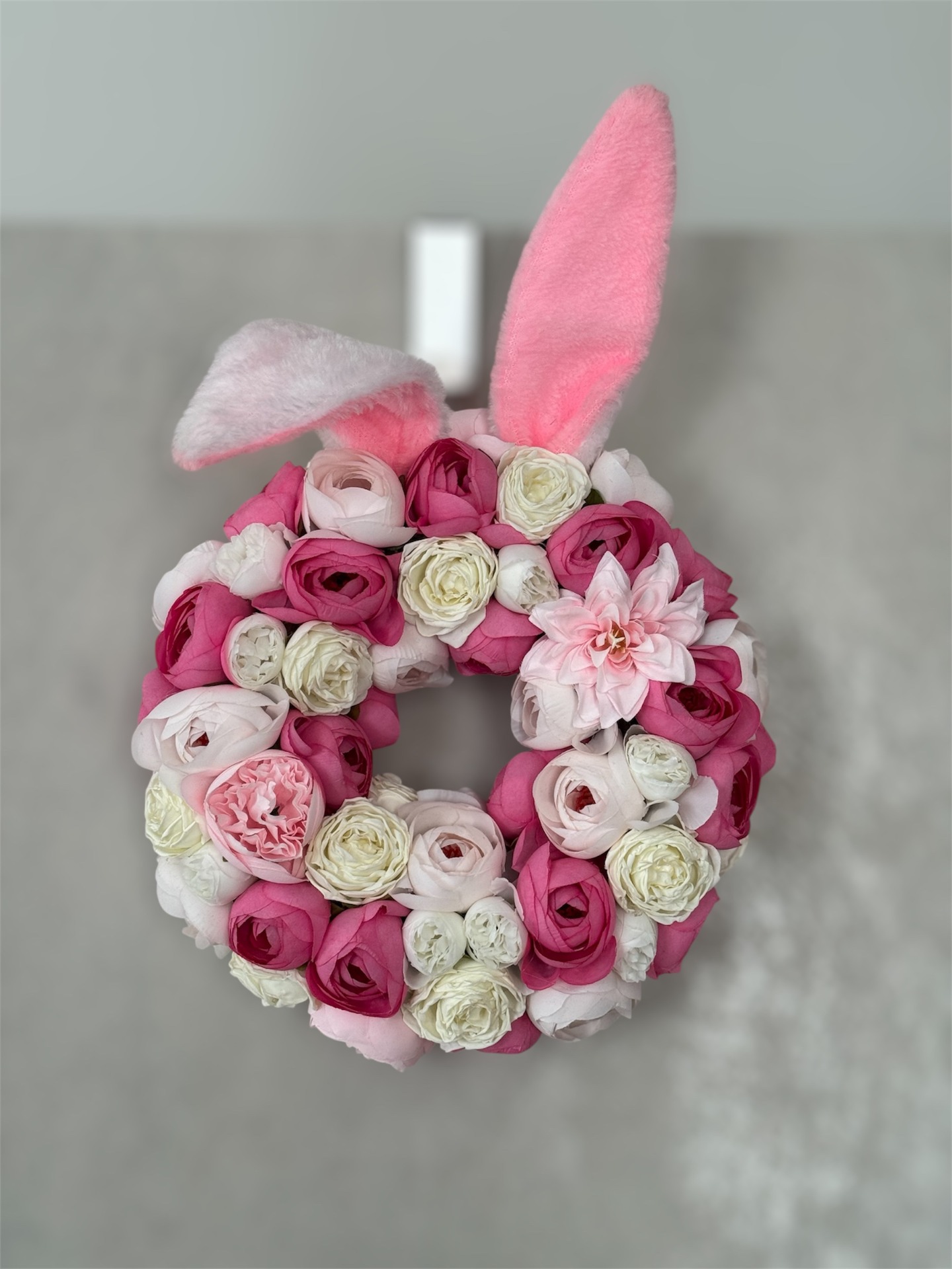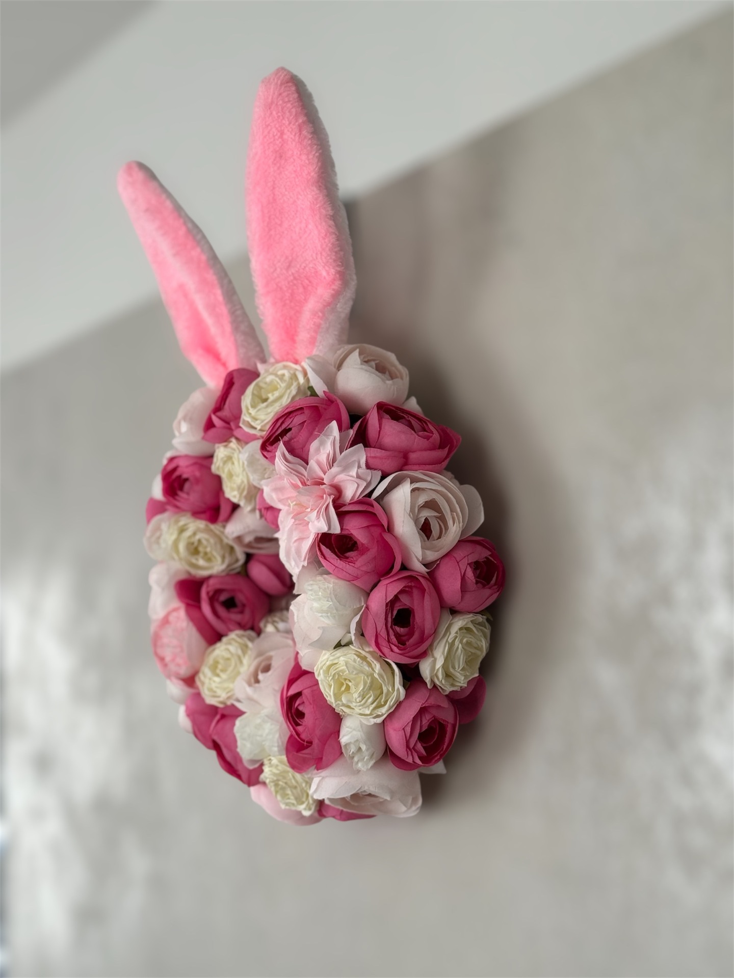Puha, szőrős nyuszifüles pink - rózsa - krém árnyalatú rózsák – ízléses húsvéti hangulat az ajtódon.