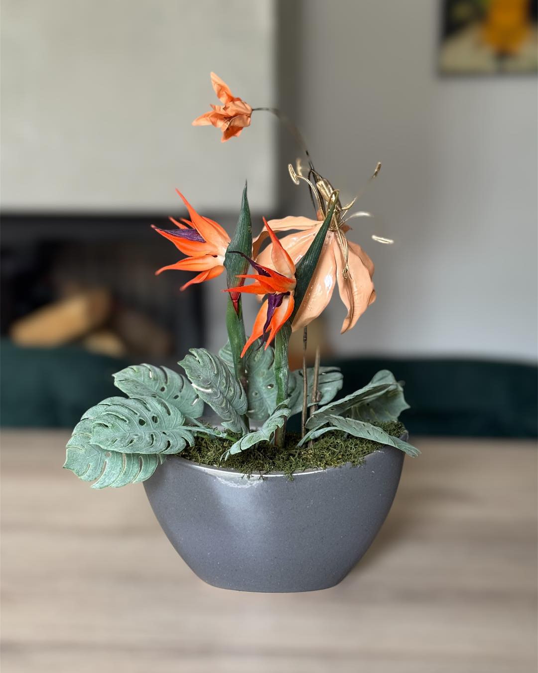 Különleges, trópusi hangulatú asztaldísz csónak alakú kerámia kaspóban, papagájvirággal.