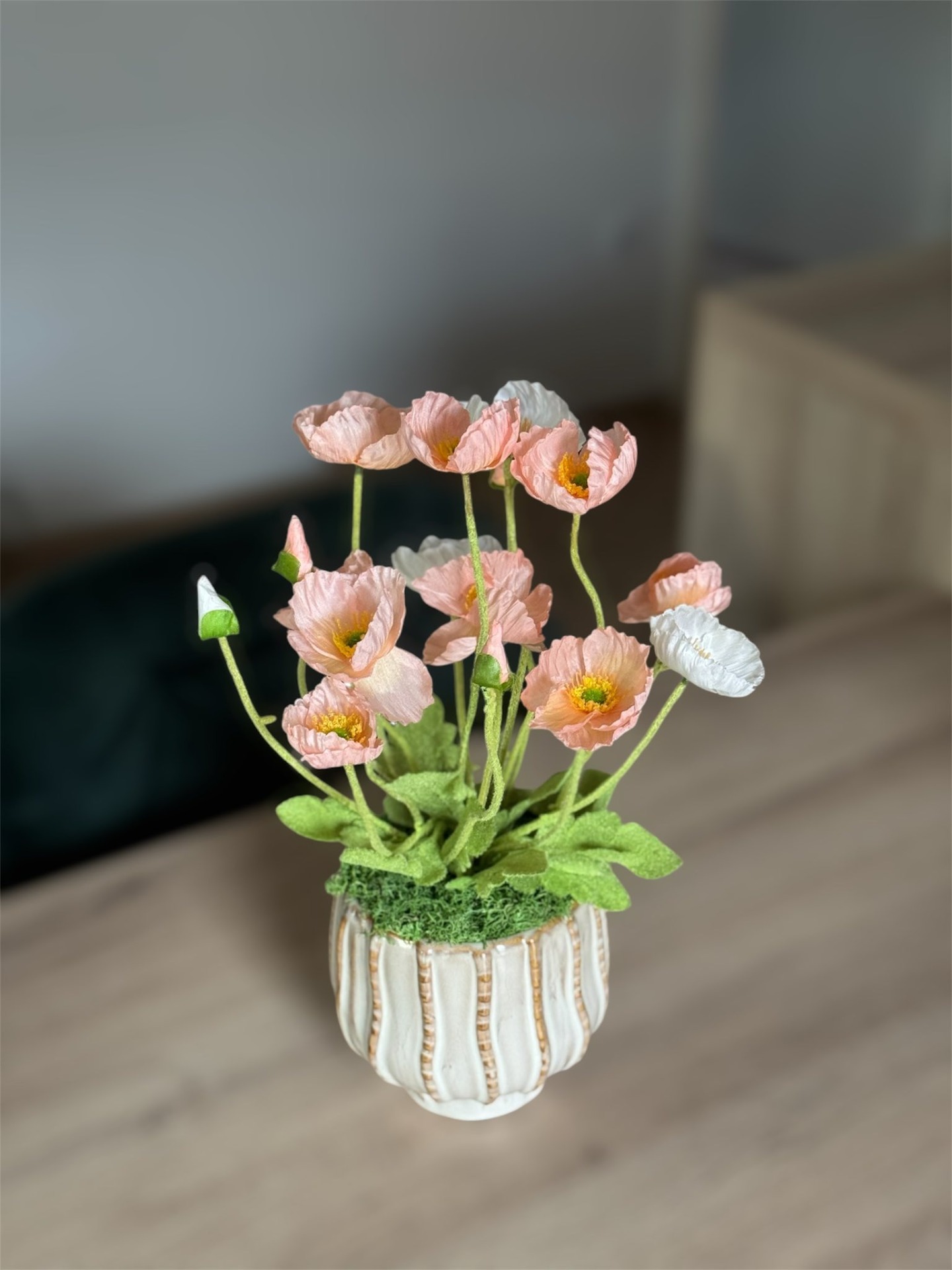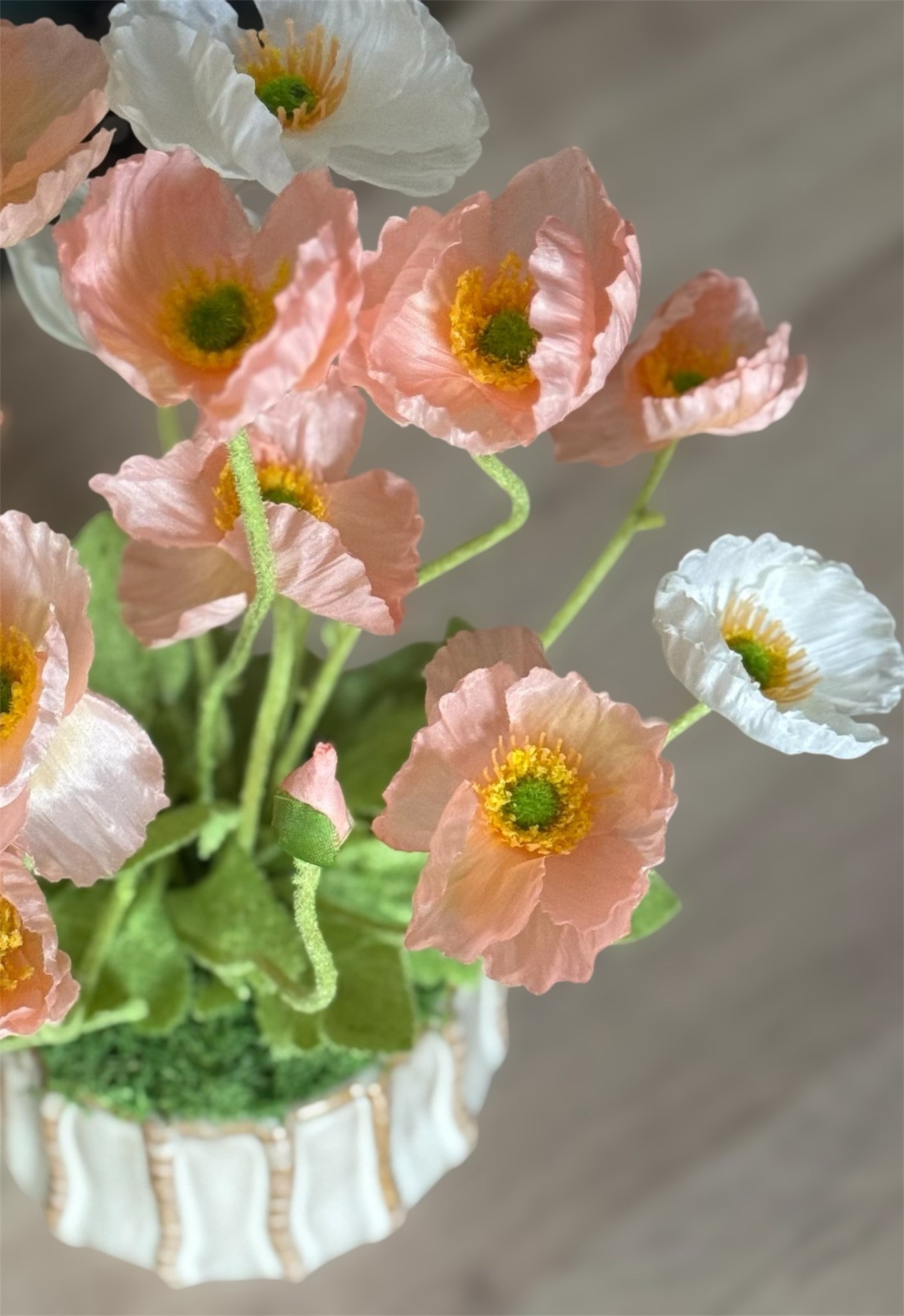 Pipacsos asztaldísz, ezúttal nem piros, hanem finom púderrózsaszín és fehér színekben, elegáns kerámia kaspóban.