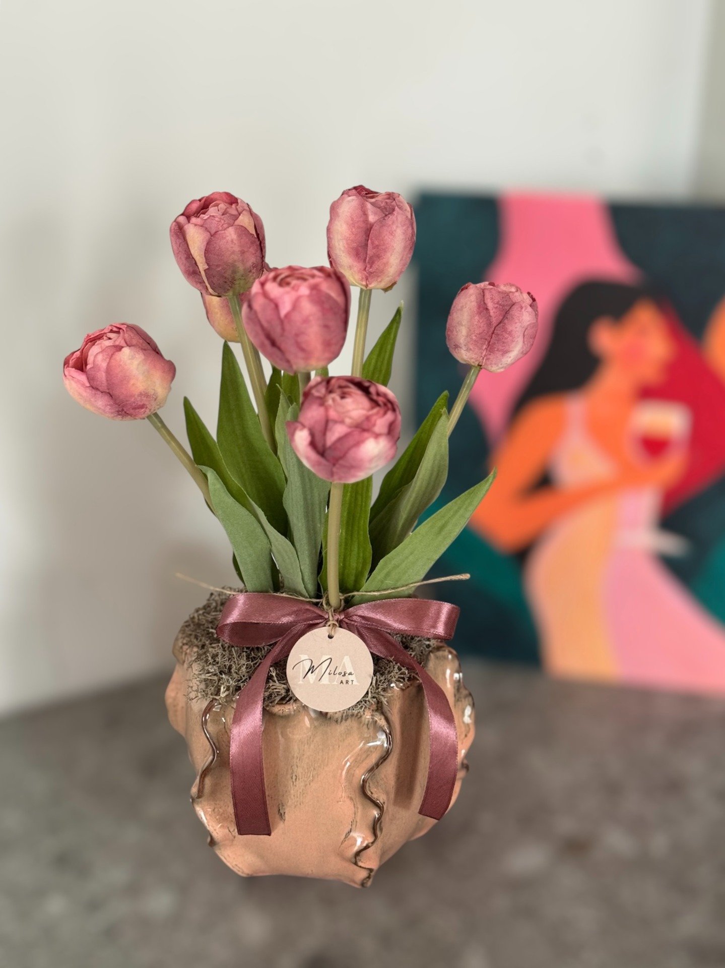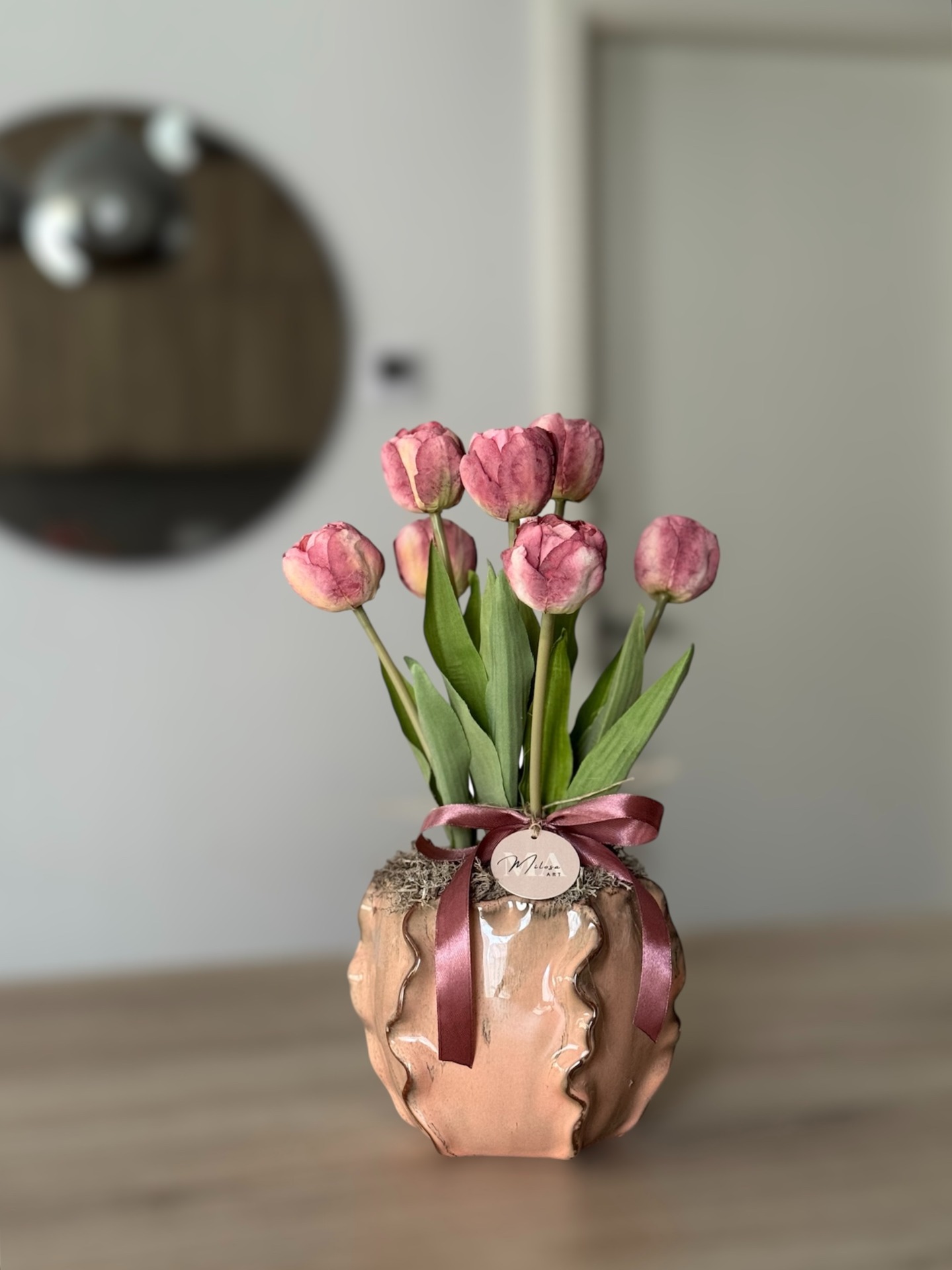 A különleges kaspó és bársonyos hatású tulipánok együtt egy igazán kifinomult, mégis meleg hangulatot teremtenek. Az a dekor, ami nem harsány, mégis minden tekintetet magára vonz.