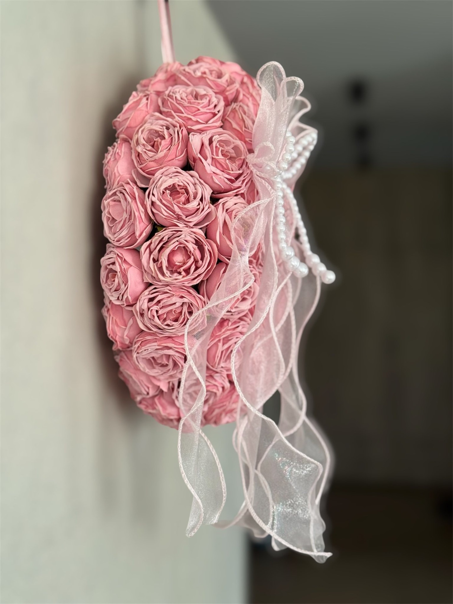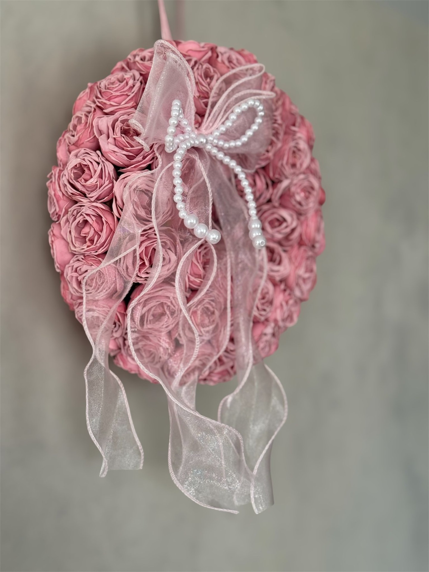Ez a púderrózsaszín rózsakoszorú gyöngyös masnival és légies organza szalagokkal igazi romantikus álomdarab.Tökéletes ajtóra, hálószobába vagy ajándékba is.