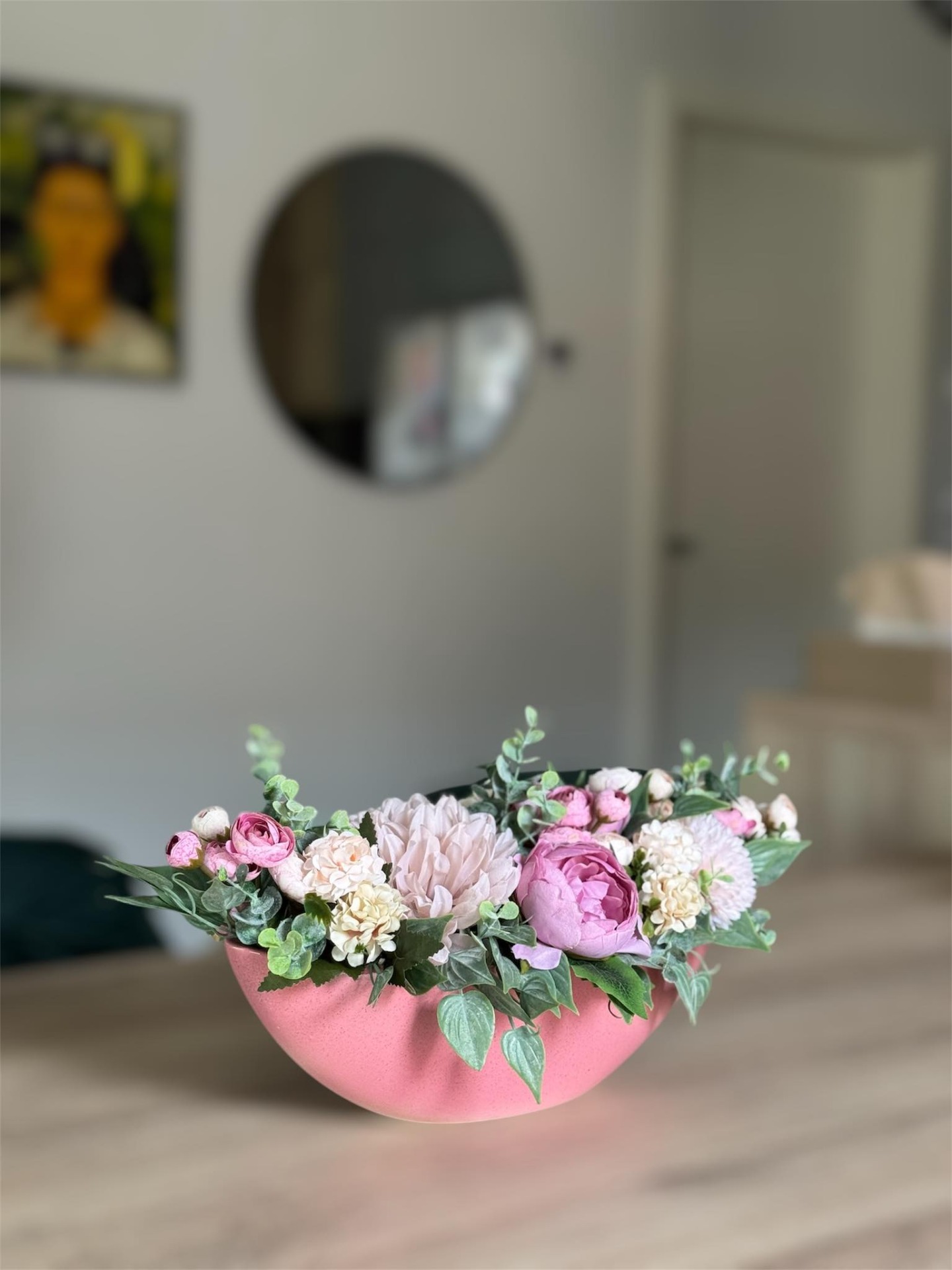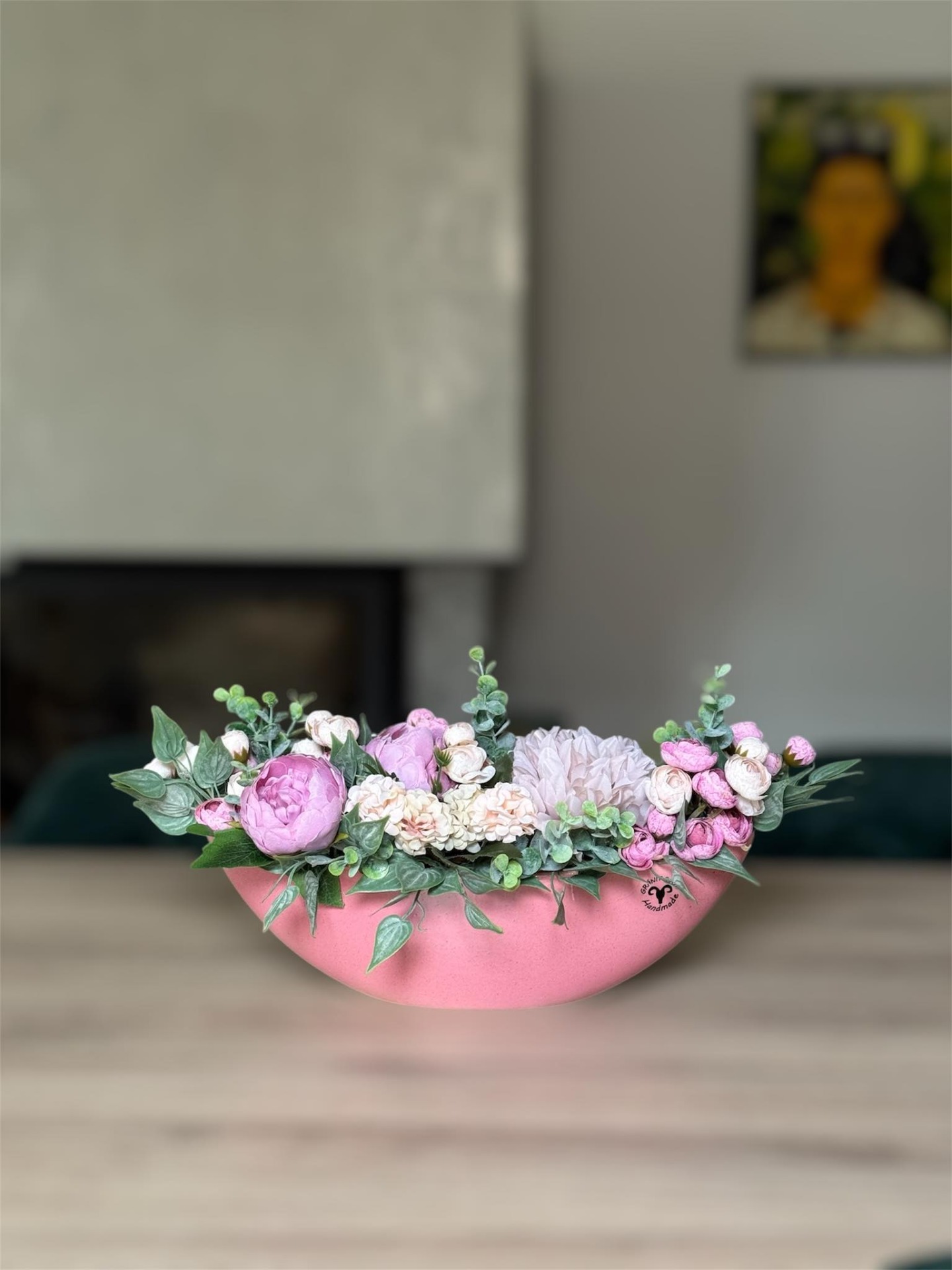 Rózsaszín 37 cm-es kerámia csónak, vegyes, színben harmonizáló virágokkal.