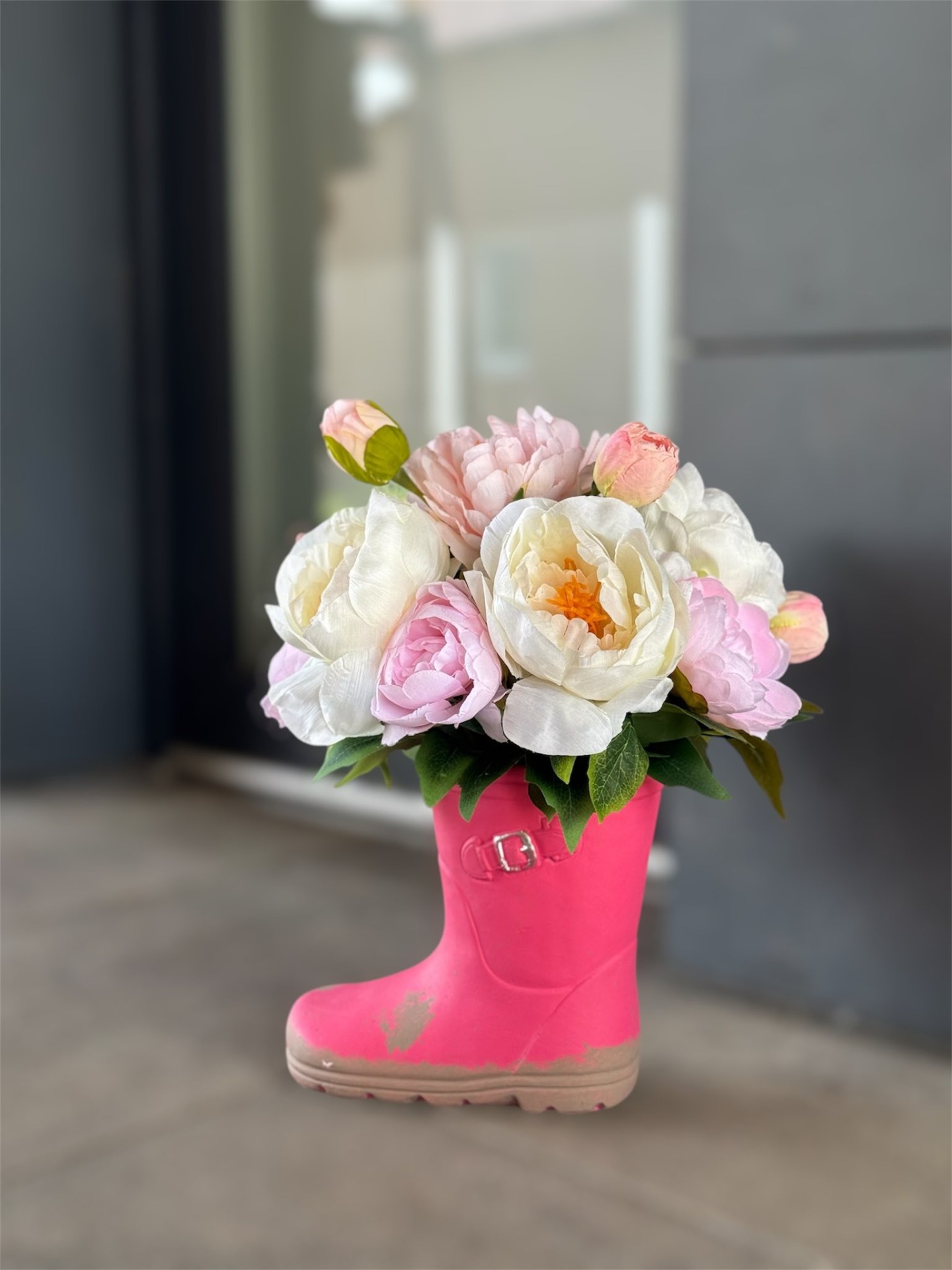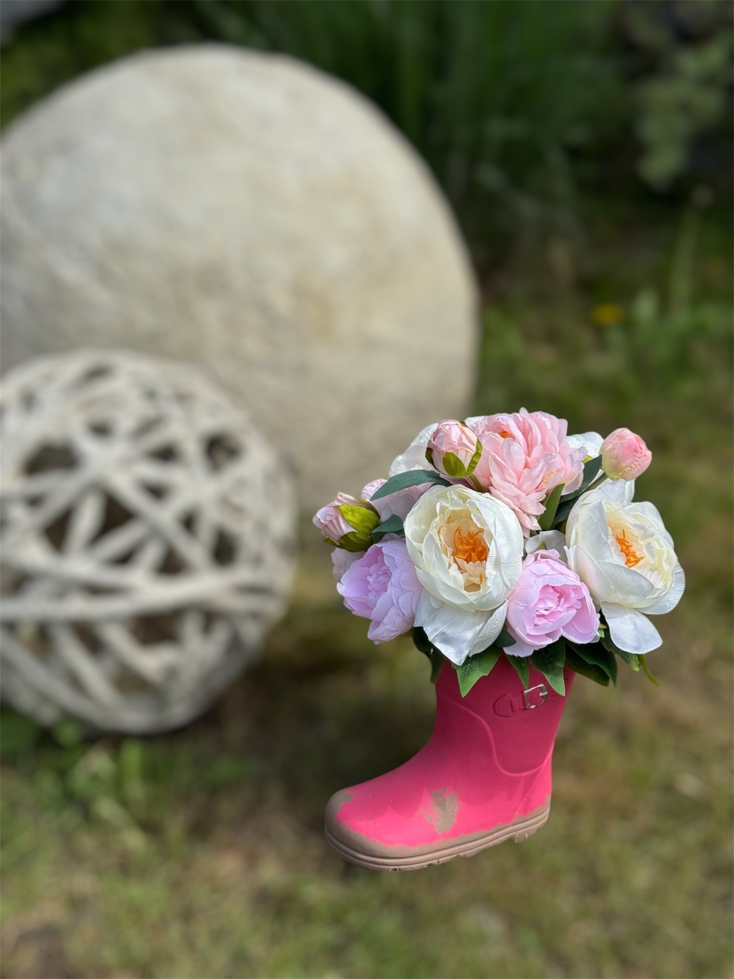 Rózsaszín súlyos, virágokkal teli kerámia dísz, melyet biztosan nem fúj el a szél. Kültérre is bátran tehető, közvetlen napfénytől védett helyre