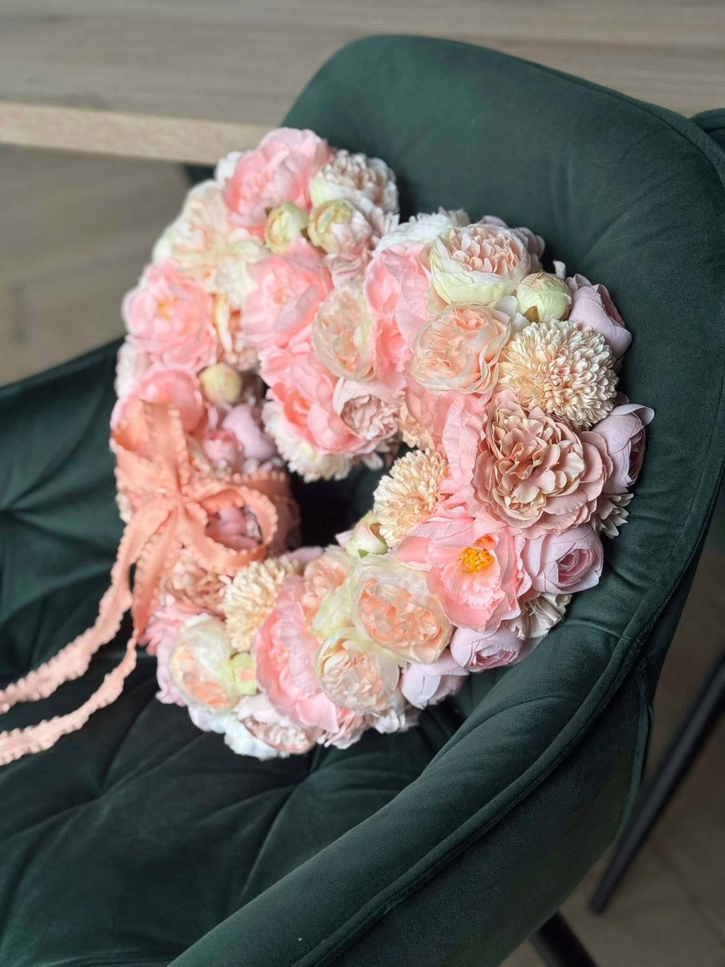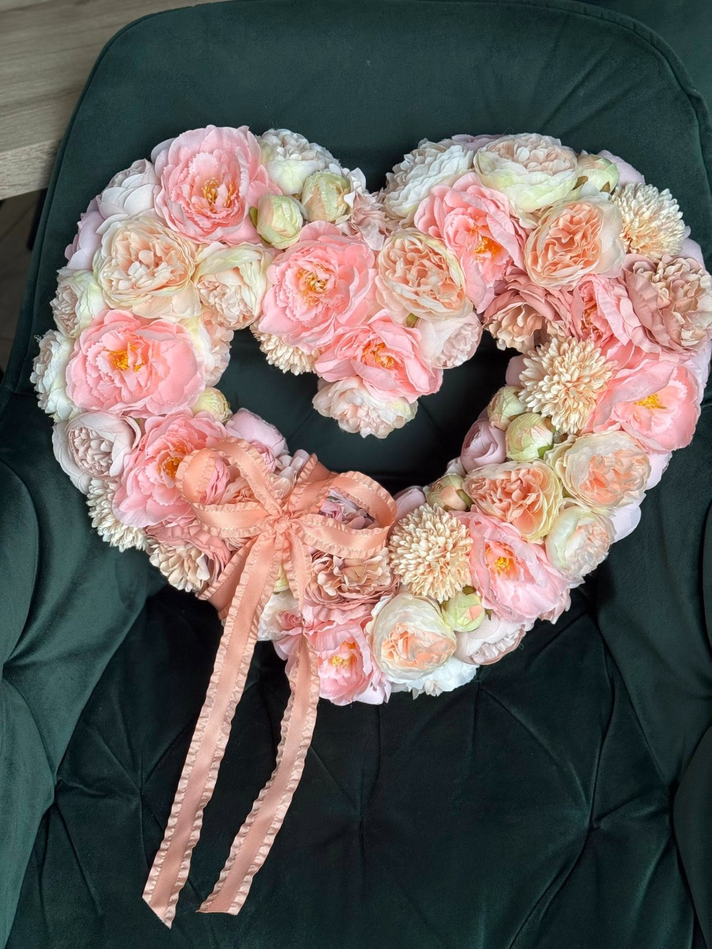 Ez a púder-rózsaszín, virágokkal gazdagon díszített szív alakú koszorú a romantika megtestesítője. Finom pasztell árnyalatok, telt rózsák és elegáns részletek – egy igazán különleges darab, ami azonnal meghitt hangulatot varázsol.