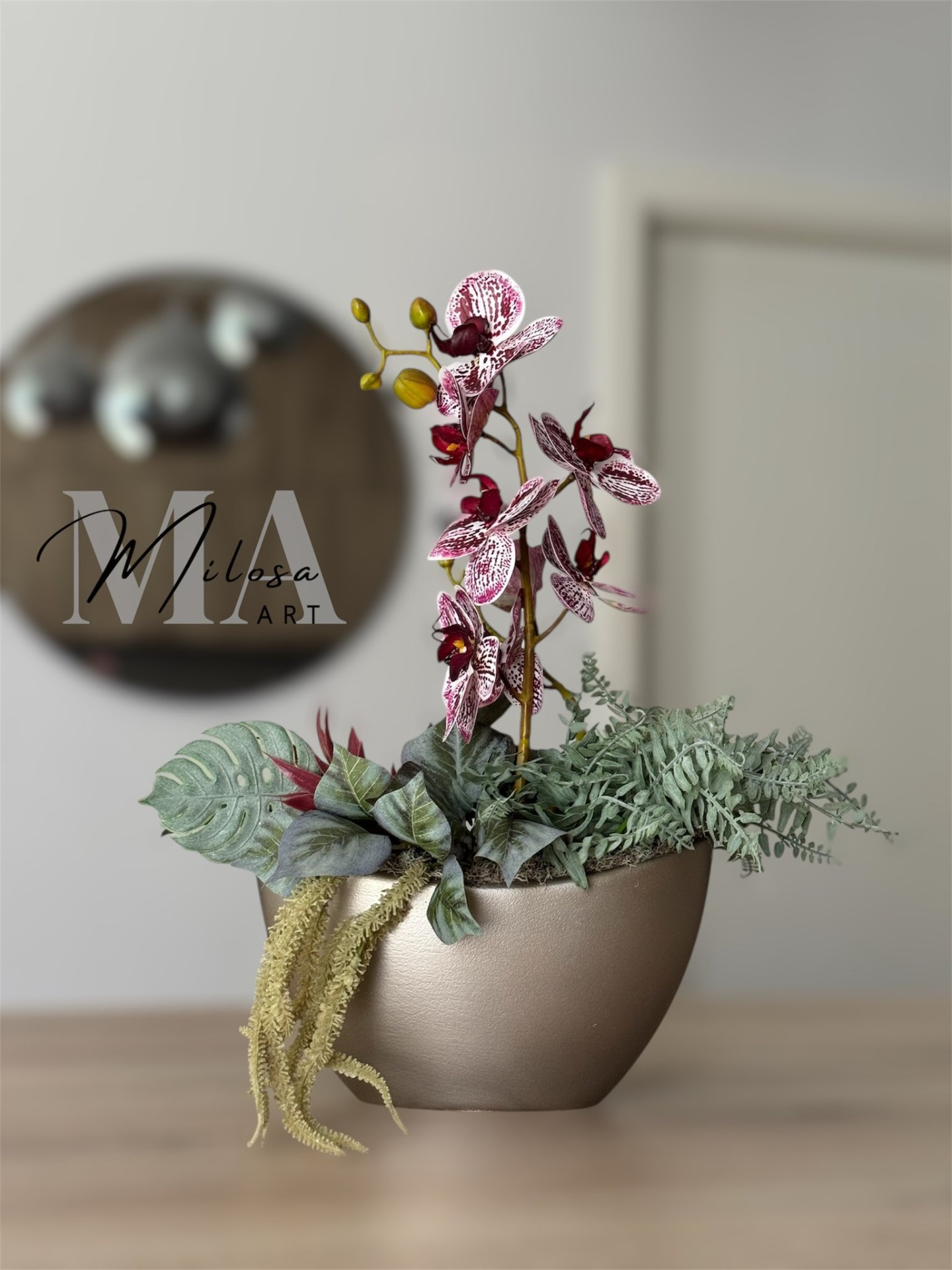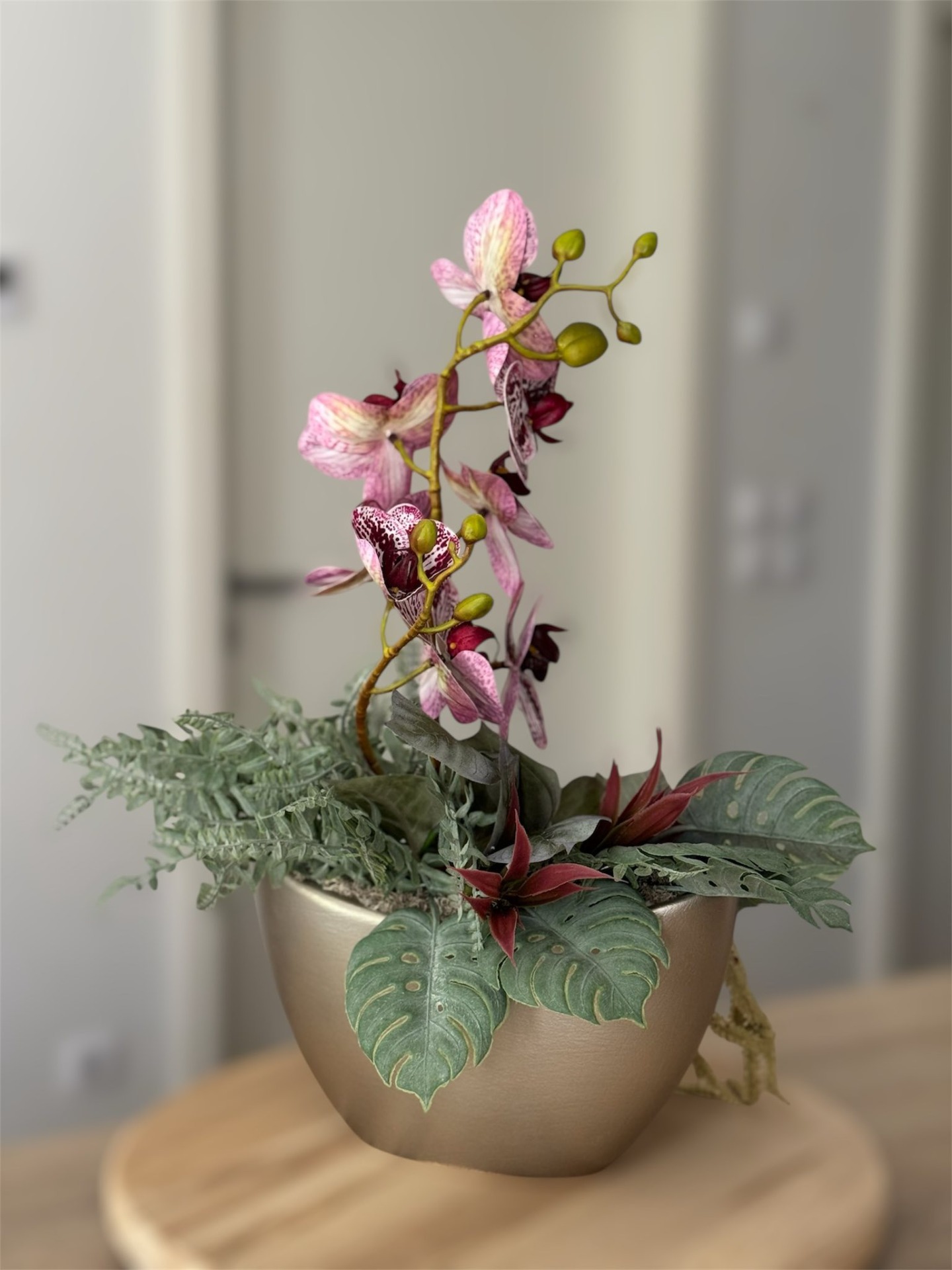 Egy csipetnyi természet az otthonodban! A pezsgő színű kaspó, mélybordó orchidea és az ezüstös-zöld levelek harmóniája igazán vonzó látványt nyújt. Trópusi hangulata miatt nagyon jól mutat a fürdőszobában is.